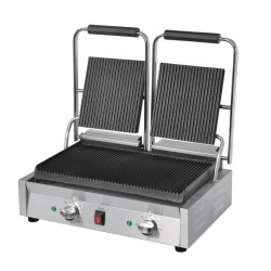 Le gril de contact Bistro Buffalo combine une construction en acier inoxydable robuste avec des plaques en fonte rainurées pour une utilisation à long terme et des résultats de grillades exceptionnels. Avec une tête pivotante réglable et des cadrans de chaleur variables pour différentes épaisseurs et températures, vous avez un contrôle total sur l'ensemble du processus de cuisson.